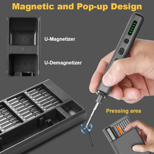 【PERS-TO-POP-OUT EN MAGNETISCH ONTWERP】Deze precisie-schroevendraaierset maakt gebruik van een innovatief push-to-pop-out ontwerp, waarmee je het deksel met slechts één klik kunt openen of sluiten, waardoor de bediening snel en eenvoudig is. De opbergdoos, schroevendraaiers en boren maken allemaal gebruik van magnetische ontwerpen om ervoor te zorgen dat het gereedschap veilig wordt geplaatst om per ongeluk vallen te voorkomen. Speciaal ontworpen gemagnetiseerde gebieden verbeteren het magnetisme van schroevendraaiers en boren met een lichte aanraking