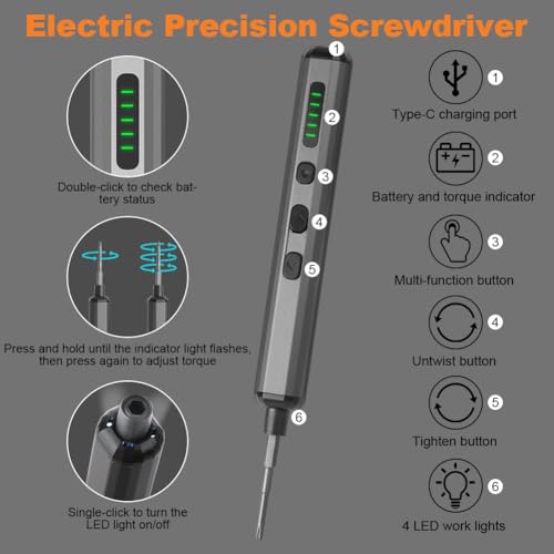 Oplaadbare batterij: deze elektrische schroevendraaier is uitgerust met een 350 mAh lithiumbatterij met grote capaciteit, die tot 120 minuten continu kan worden gebruikt en een standby-tijd van maximaal 60 dagen heeft, wat zorgt voor een zorgeloze langdurige werking. De oplaadtijd duurt slechts 1 uur en maakt gebruik van een universele Type-C oplaadinterface, die handig en snel op te laden is en een sterke compatibiliteit heeft