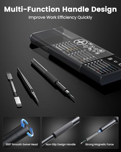 39-in-1 mini-precisieschroevendraaierset: de kleine schroevendraaierset wordt geleverd met 36 verschillende S2-bits (Phillips, Torx, platte kop, Triwing, Hex, Pentalobe, Triangle). Deze schroevendraaierset heeft alles wat de professional nodig heeft. De metalen spudger helpt bij stoten en steken, en het pincet is ideaal voor het werken met micro-elektronica