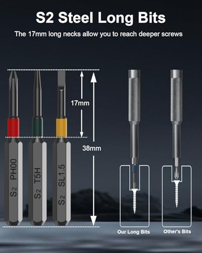 S2-stalen bits en magnetisch: alle precisiebits zijn gemaakt van het beste staal (staal voor S2) en de hardheid tot 60HRC, zijn bestand tegen slijtage, oxidatie en corrosie, garanderen langdurig gebruik. Bovendien kunnen de sterke magnetiseerbare schroeven gemakkelijk vasthouden en vasthouden, wat je helpt om alle kleine schroeven te hanteren