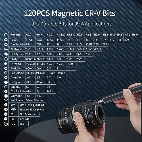 Multifunctioneel: wordt geleverd met 120 precisiebits, verschillende schroevendraaierbits met verschillende specificaties kunnen gemakkelijk aan verschillende behoeften voldoen.